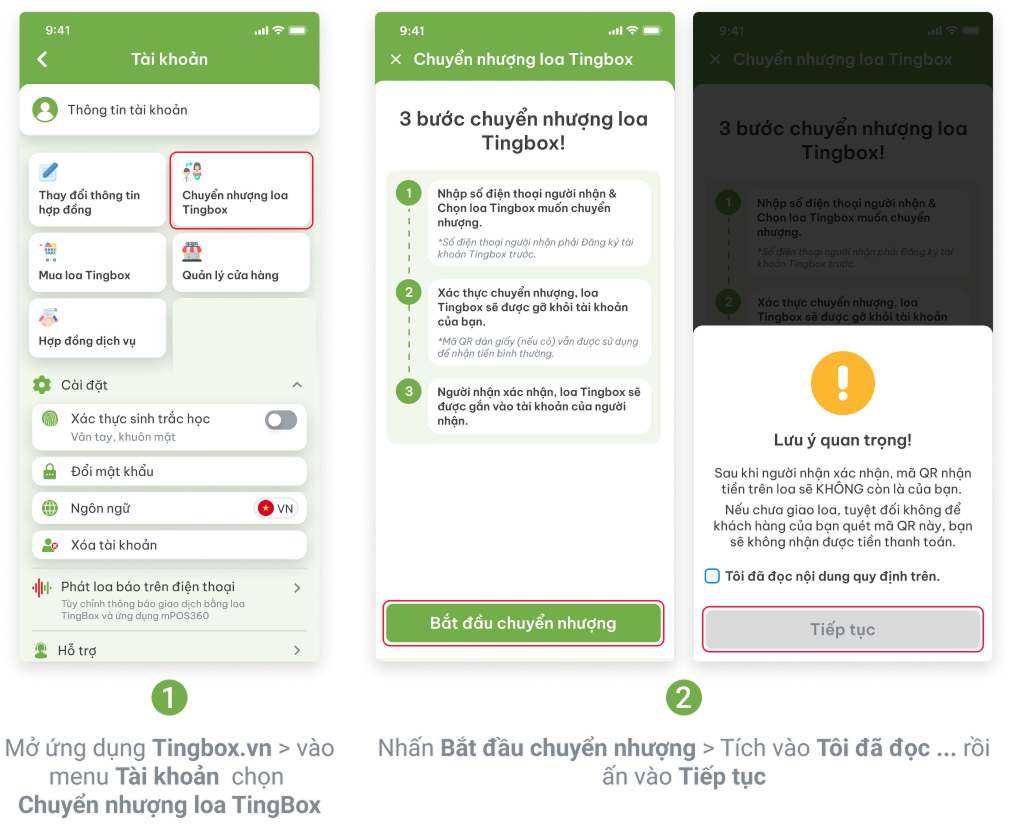 Chuyển nhượng loa Tingbox giúp Merchant dễ dàng chuyển giao thiết bị cho người khác khi không còn nhu cầu sử dụng. Mọi thao tác được thực hiện nhanh chóng ngay trên ứng dụng Tingbox, không cần thêm bất kỳ bước phức tạp nào!