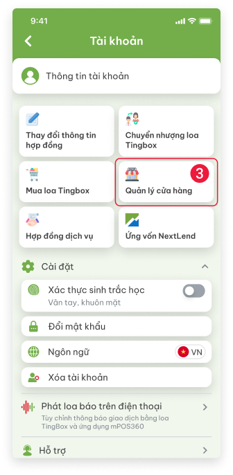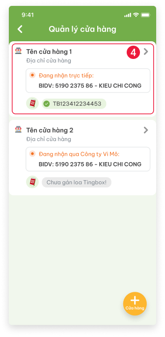 - (số 2) Nhấn vào Menu Cửa hàng hoặc Tài khoản để vào mục Quản lý cửa hàng (số 3) > Chọn cửa hàng (số 4) muốn cài đặt.