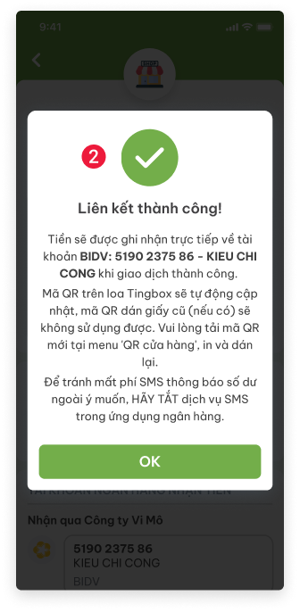- (số 2) Hoàn tất mã QR sẽ tự động cập nhật thành mã mới (Lưu ý đọc kỹ nội dung hiển thị trên ứng dụng)