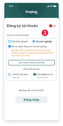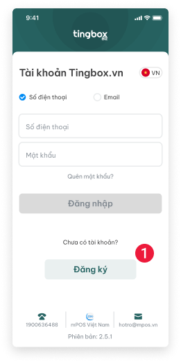 - (số 1) Mở ứng dụng Tingbox Biz, chọn "Đăng ký" trên màn hình đăng nhập
