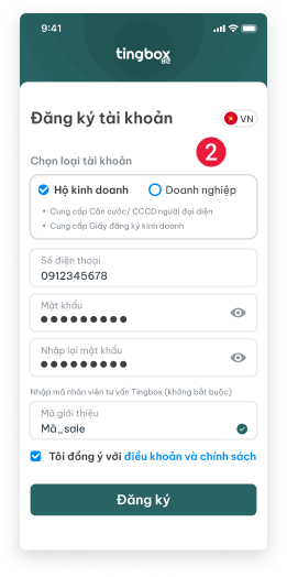 - (số 2) Nếu bạn là Hộ kinh doanh: Nhập số điện thoại, nhập mật khẩu và đồng ý với điều khoản sử dụng, sau đó nhấn "Đăng ký".
