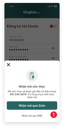 - (Số 1) Chọn nhận mã xác thực qua Zalo hoặc qua SMS