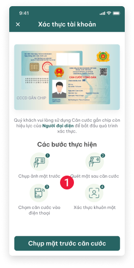 - (Số 1) 4 bước Xác thực Căn cước gắn chip còn hiệu lực của Người đại diện: Chụp ảnh mặt trước → Quét mặt sau → Chạm căn cước vào điện thoại → Xác thực khuôn mặt