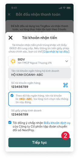 1. Tải ứng dụng Tingbox Biz 2. Đăng ký tài khoản Tingbox Biz 3. Cung cấp Căn cước công dân và Giấy phép kinh doanh 4. Cập nhật hồ sơ nhận thanh toán
