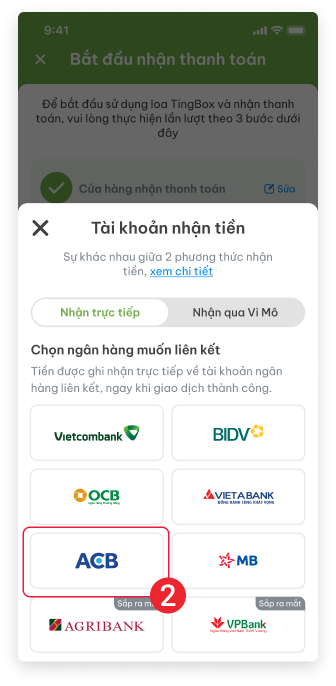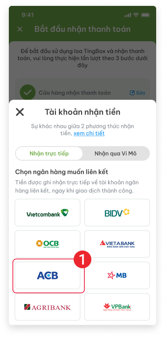 Sau khi đăng ký tài khoản Tingbox.vn, Quý khách khai báo cửa hàng, gán thiết bị và “Khai báo tài khoản nhận tiền”