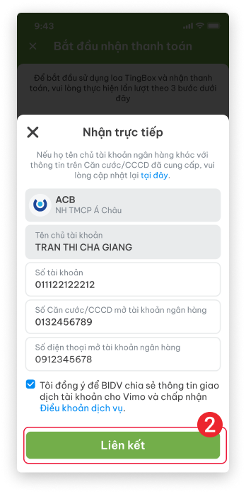 Chọn ngân hàng ACB sau đó nhập số tài khoản, số căn cước/CCCD, Số điện thoại, Email mở tài khoản ngân hàng. Ấn vào “Liên kết”