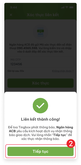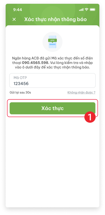Nhập mã OTP > ấn “Xác thực”, sau đó ấn “Tiếp tục” để kích hoạt thông báo giao dịch Nếu không nhận được, vui lòng liên hệ ngân hàng để được hỗ trợ.