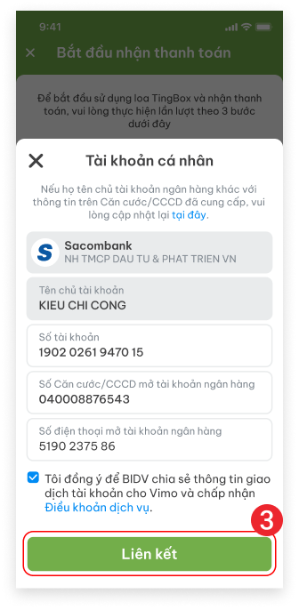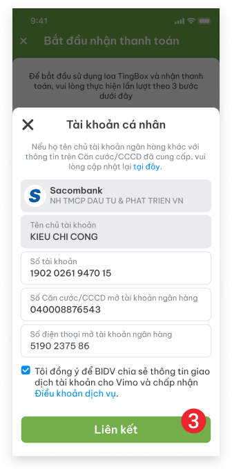 Chọn ngân hàng Sacombank > chọn loại tài khoản liên kết và nhấn “Tiếp tục”, sau đó nhập số tài khoản, số căn cước/CCCD, Số điện thoại mở tài khoản ngân hàng. Ấn vào “Liên kết”
