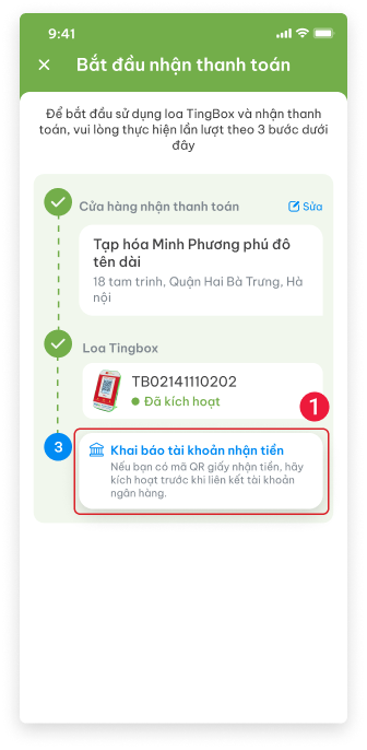 - (số 1) Chọn Khai báo tài khoản nhận tiền