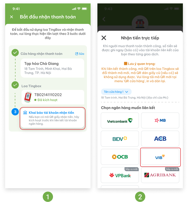 - Tại màn hình “Bắt đầu nhận thanh toán” chọn “Khai báo tài khoản nhận tiền”