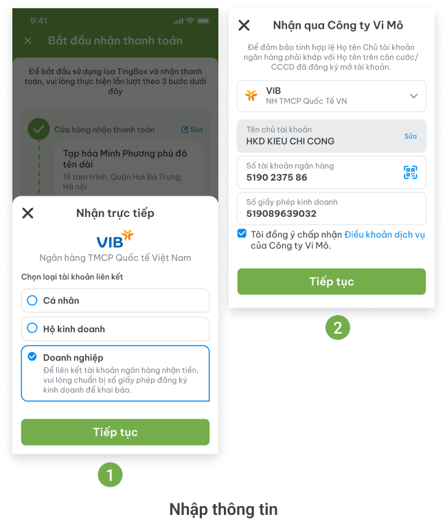 Chọn “Doanh nghiệp” rồi nhấn “Tiếp tục” → Nhập “Số tài khoản ngân hàng doanh nghiệp”, “Mã số thuế”, “Số điện thoại mở tài khoản” và chọn “Liên kết”